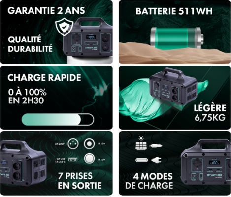 La batterie nomade 800 se recharge en 2h30 sur le secteur et en seulement 4 heures via son panneau solaire de 160W ! ce qui en fait l’une des batteries les plus rapide du marché. Pour en savoir plus, sur les durées de chargement des batteries , cliquez sur le bouton.